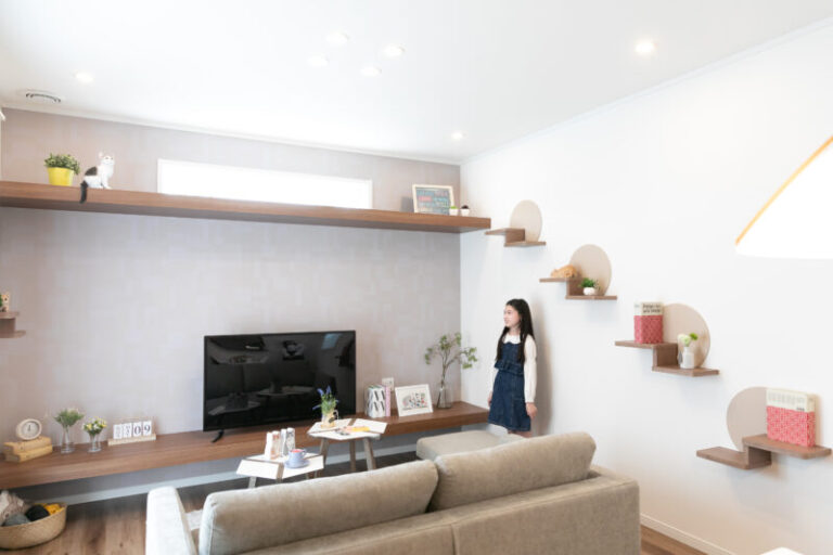 部分的ではなく、空間全体を使えるよう、リビングの三方向に猫のルートを確保。テレビカウンタ―の上にもキャットウォークを造ることで、人と猫がそれぞれ心地良く共存して暮らせます。