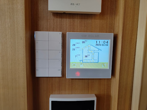 屋根裏の機械室には「OMソーラー」というシステムがあり、屋根に降り注ぐ太陽の熱を利用して家全体を暖めたり換気したりしています。冬でも足元からじんわりとした暖かさを感じられる優れものです。