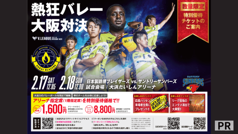 堺のバレーボールチーム「日本製鉄堺ブレイザーズ」のV.LEAGUEホームゲーム堺大会(サントリーサンバーズ戦)の特別優待チケットのご案内です。
