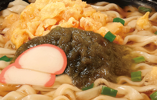 牛かすととろろ昆布の旨味があふれる「大阪かすうどん」。