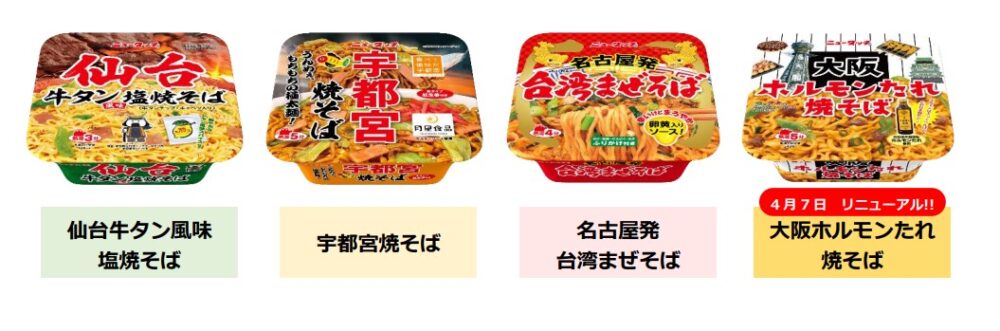 「仙台牛タン風味塩焼そば」、「宇都宮焼そば」、「 名古屋発台湾まぜそば 」「大阪ホルモンたれ焼そば」の全4品が発売されています。