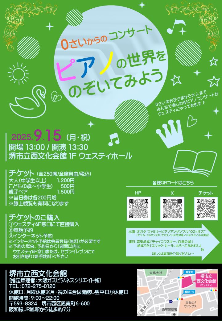 2025年9月15日(月・祝)に堺市西文化会館にて、【0さいからのコンサート ピアノの世界をのぞいてみよう】が開催されます。