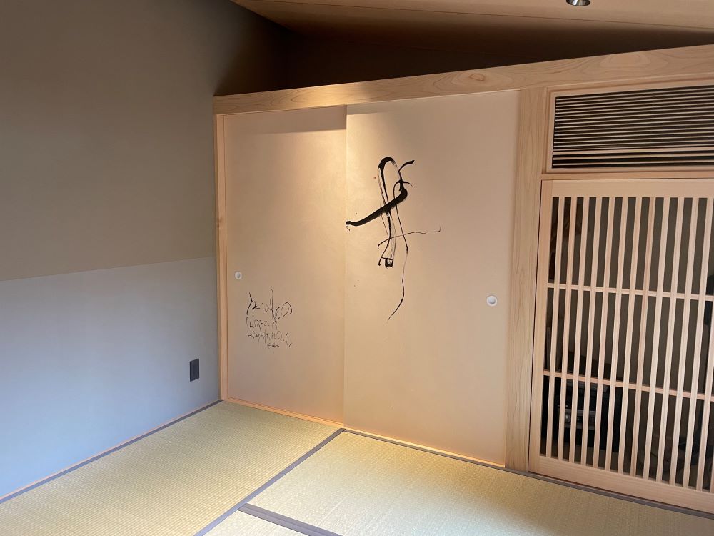 和室の壁には、書道家・西村佳子さんが手掛けた与謝野晶子の歌や「柳」の書が描かれており、堺の文人文化をさりげなく感じられる空間になっています。