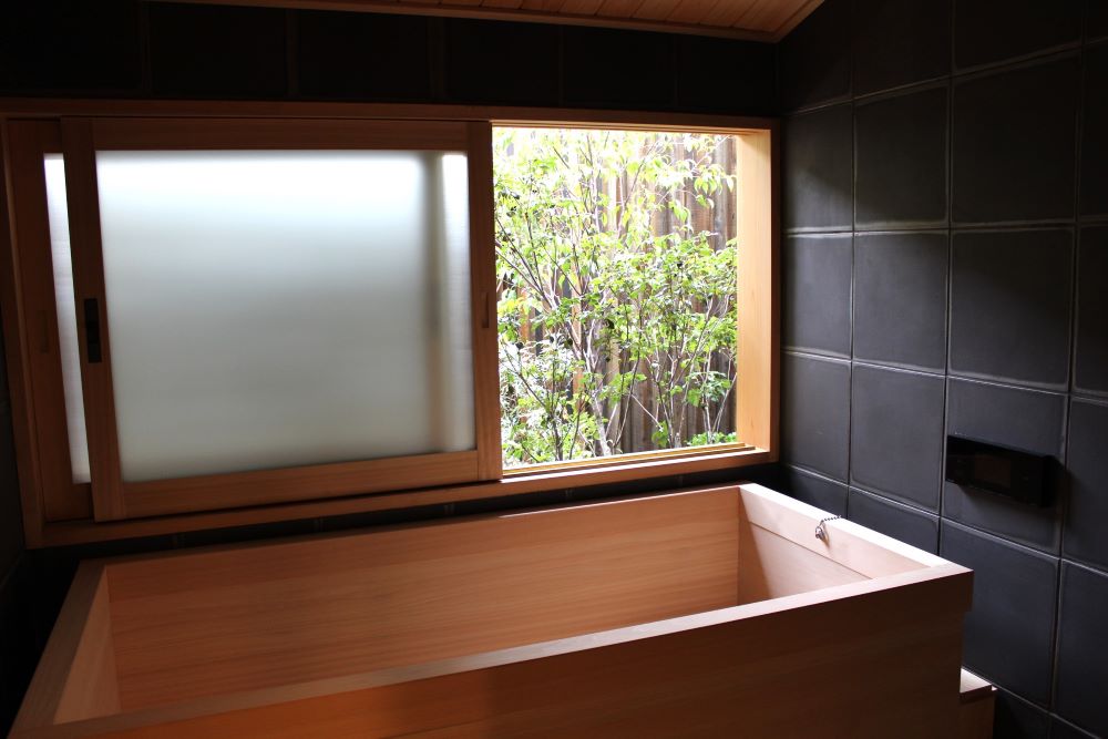 立派な檜風呂からは中庭を眺められる贅沢な仕様になっています。