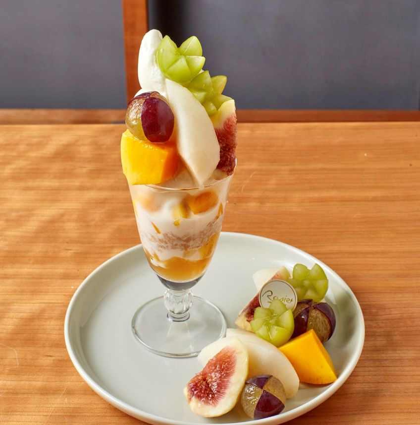 完熟いちじく、最高ランクの梨、シャインマスカット晴王など厳選した旬の果物を味わえる季節のオススメパフェです。