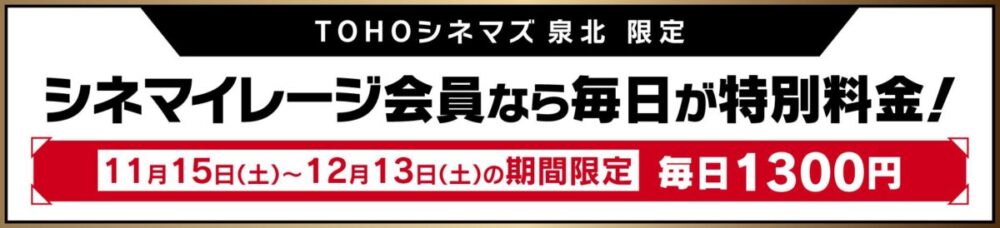 割引内容:シネマイレージ会員さまは、期間中いつでも1,300円でご鑑賞いただけます!