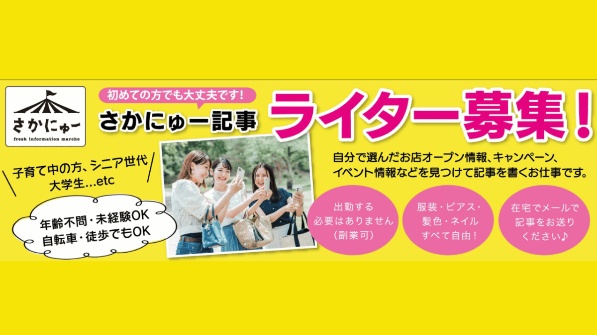 堺・南河内エリアの情報を網羅するWEBマガジン『さかにゅー』では、『さかにゅー』を一緒に盛り上げてくれる『さかにゅーサポーター』を多数募集中です! ★未経験OK […]